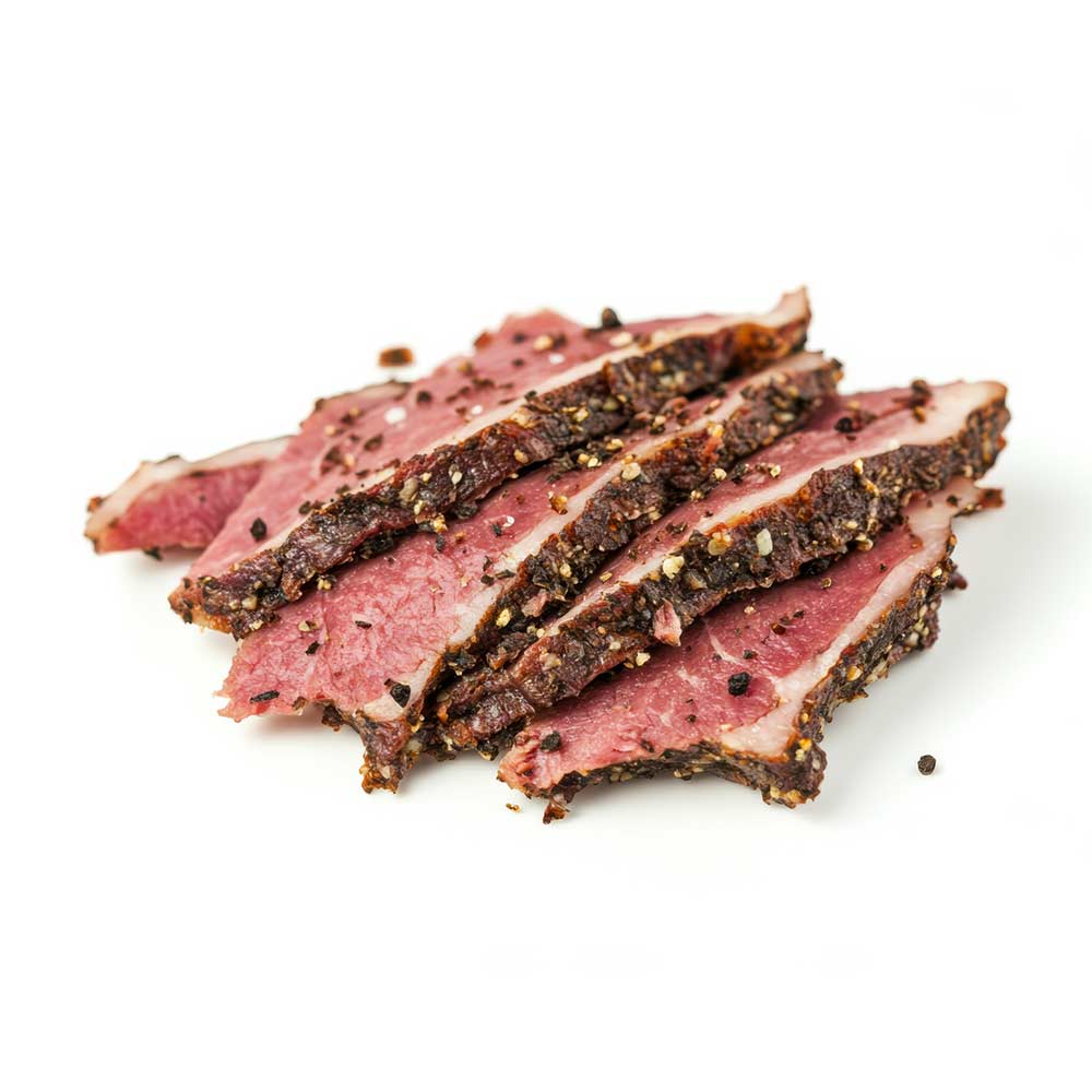 • Pastrami de bœuf artisanal, saumuré, épicé aux mélanges maison, fumé puis cuit doucement pour un régal fondant et relevé, parfait pour les assiettes signature.
